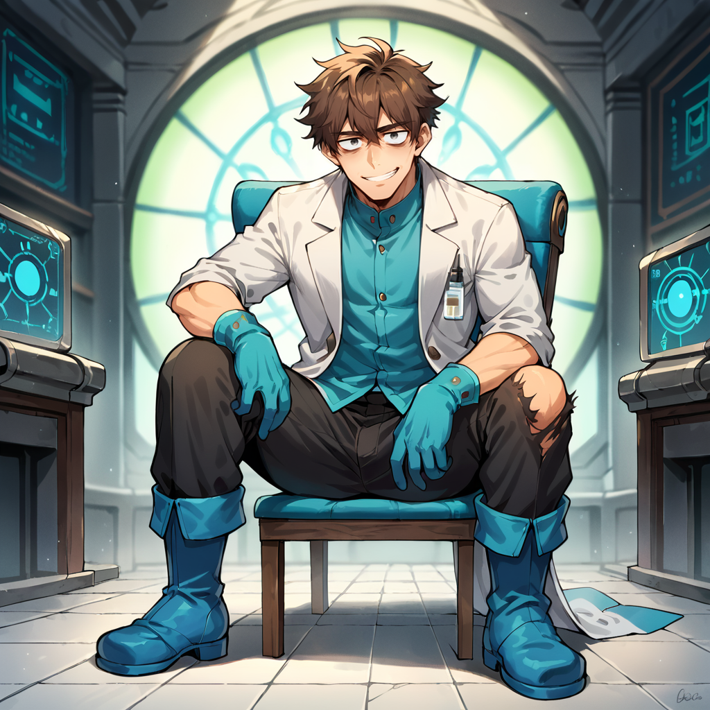 white coat, long coat, scientist, cyan gloves, blue gloves, elbow sleeve, grey wristband, black pants, torn pants, cyan boots, blue boots