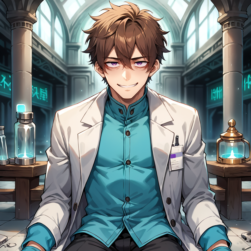 white coat, long coat, scientist, cyan gloves, blue gloves, elbow sleeve, grey wristband, black pants, torn pants, cyan boots, blue boots