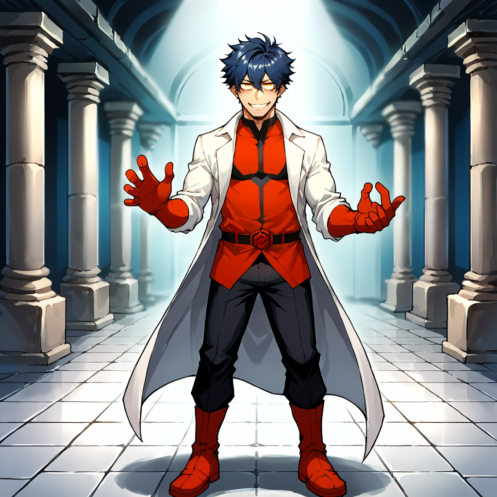 white coat, long coat, scientist, red gloves, elbow sleeve, grey wristband, black pants, torn pants, red boots, superhero, super sentai