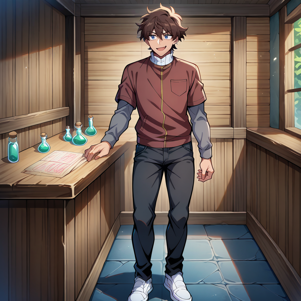 dark red shirt, brown jacket, elbow sleeve, grey sleeve cuffs, white collar, black pants, jeans, white shoes