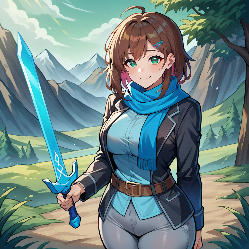 Outfit Prompts blue scarf, black jacket, open jacket, light blue shirt, gray pants, brown boots, brown belt