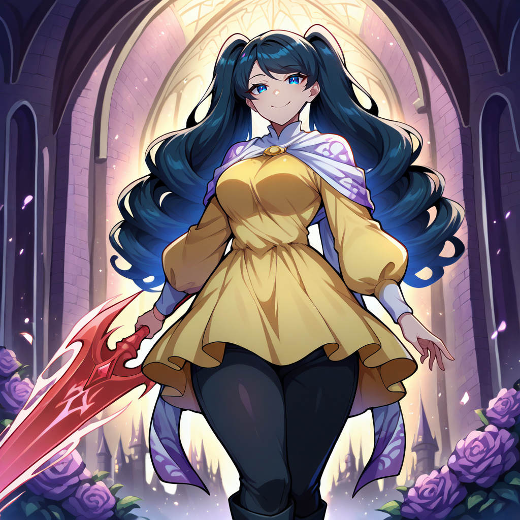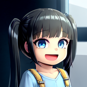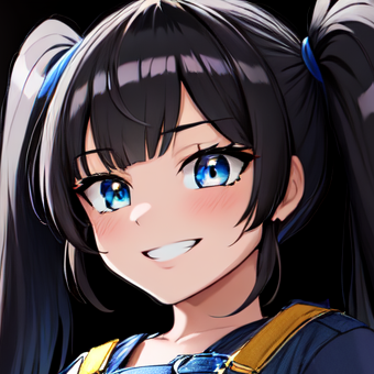 1girl, solo, black hair, curly hair, long hair, twintails, bangs, swept bangs, blue eyes