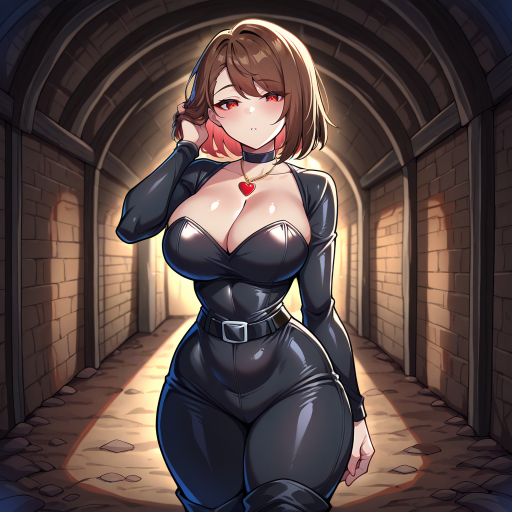 Outfit Prompts black shirt, cleavage, skin tight, black corset, long sleeves, black pants, black belt, black boots, black choker, red heart pendant