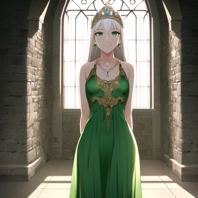 Green dress, ornate dress, gold trim, tiara, necklace, earrings,
