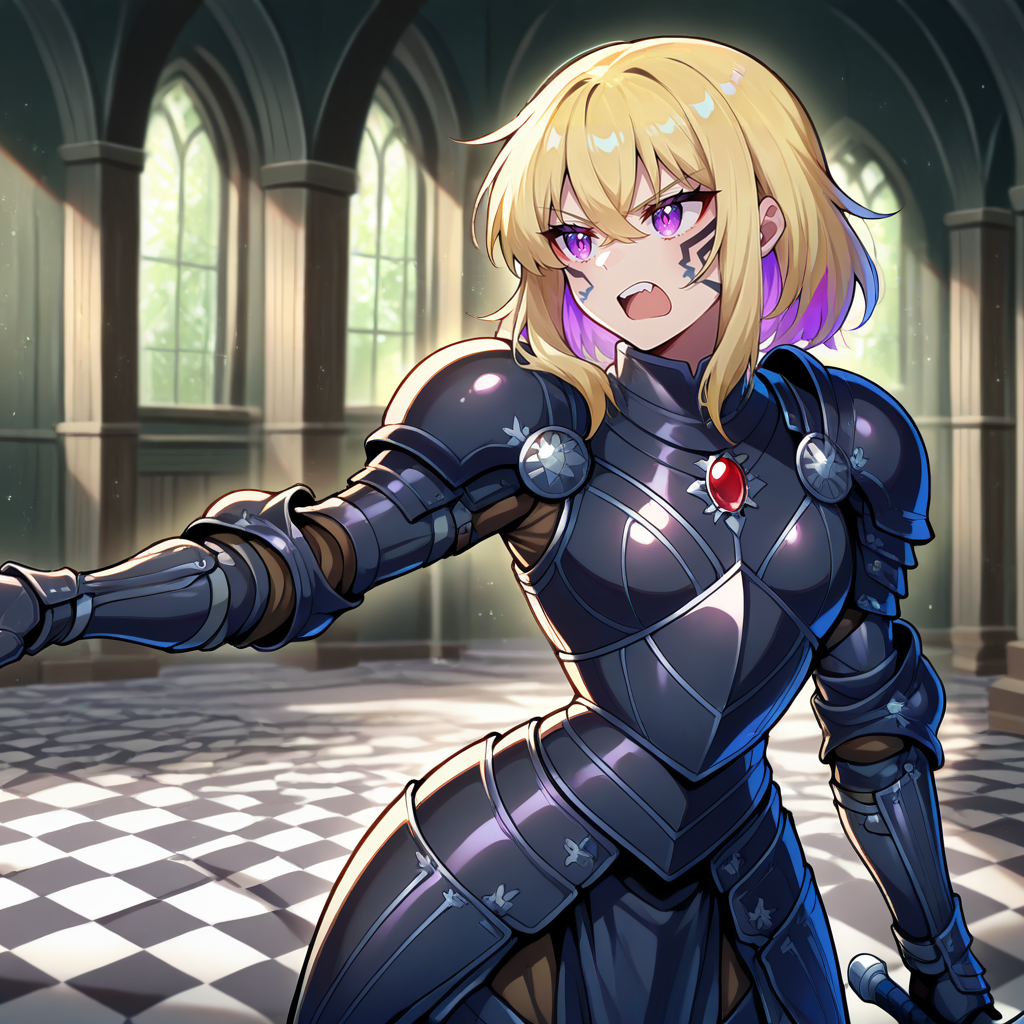 tribal tattoo, black facial mark, facial tattoo, armored boots, shoulder armor, full armor, breastplate, black armor, knight, knight \(chess\), chess piece, red gem
