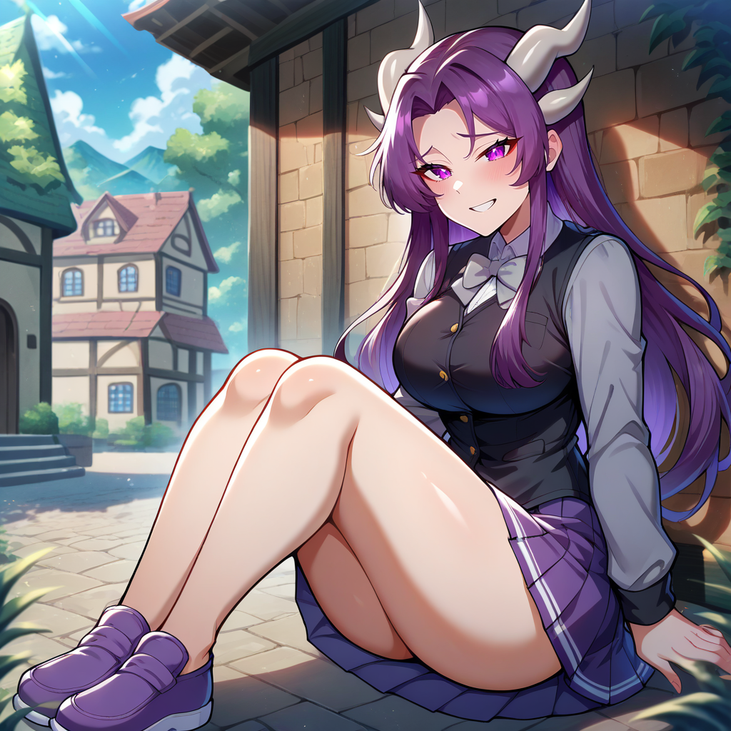 Outfit Prompts school uniform, black vest, grey stole, grey sleeves, black wrist bands, purple skirt, pleated skirt, purple shoes