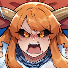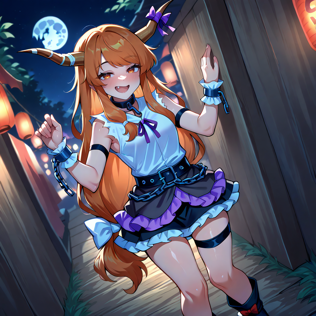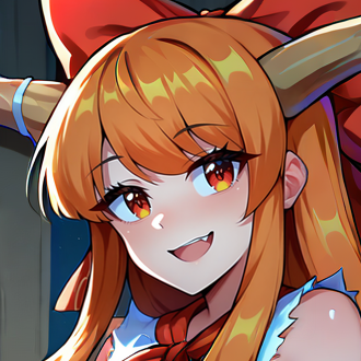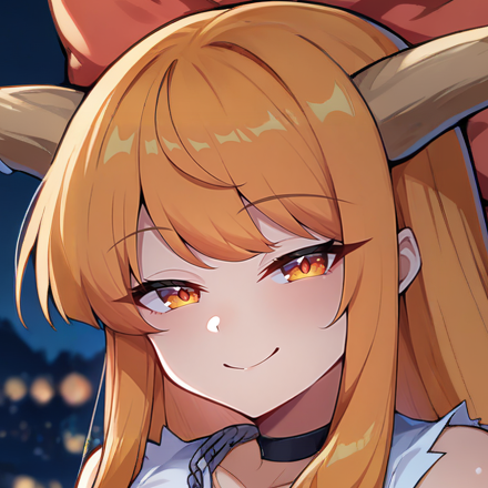 Physical Prompts 1girl, solo, ibuki suika, orange hair, swept bangs, sidelocks, very long hair, low tied hair, low ponytail, oni horns, long horns, wooden horns, amber eyes