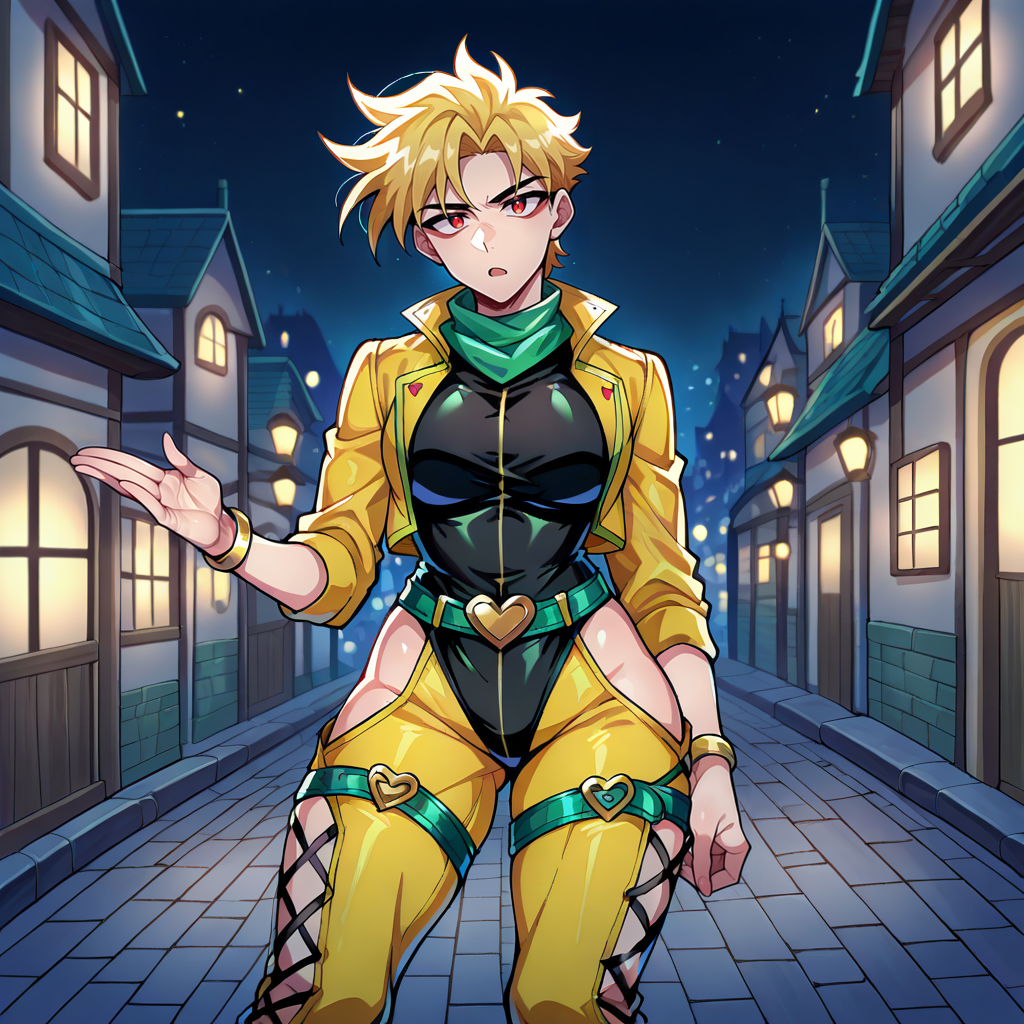 Outfit Prompts green bandana, black leotard, highleg leotard, yellow jacket, open jacket, green trim, hip vent, green belt, heart belt, gold bracelet, thigh belt, inner thighs cutout, yellow pants, black high heel boots, cross-laced footwear