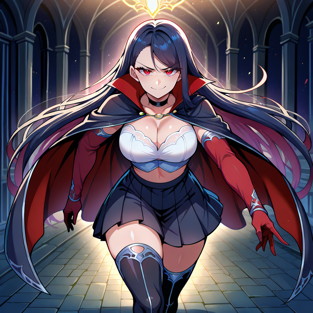 Outfit Prompts white crop top, lace crop top, detached sleeves, red sleeves, red gloves, cleavage, black choker, black skirt, pleated skirt, zettai ryouiki, black boots, thigh boots, silver trim, black cloak