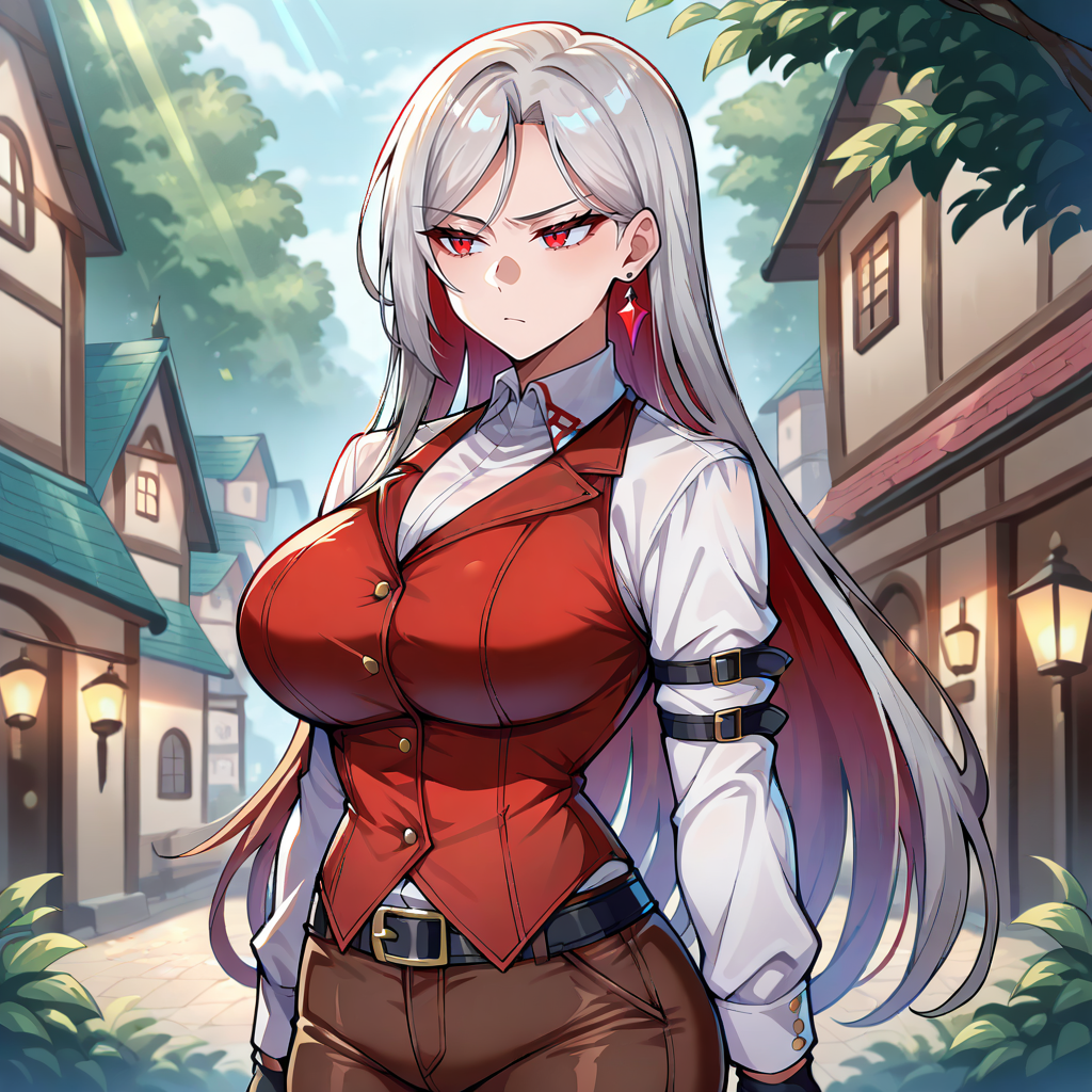 Outfit Prompts red earring, single earring, white shirt long sleeves red vest,collared shirt, black gloves, arm belt, black belt, dark brown pants, black shoes