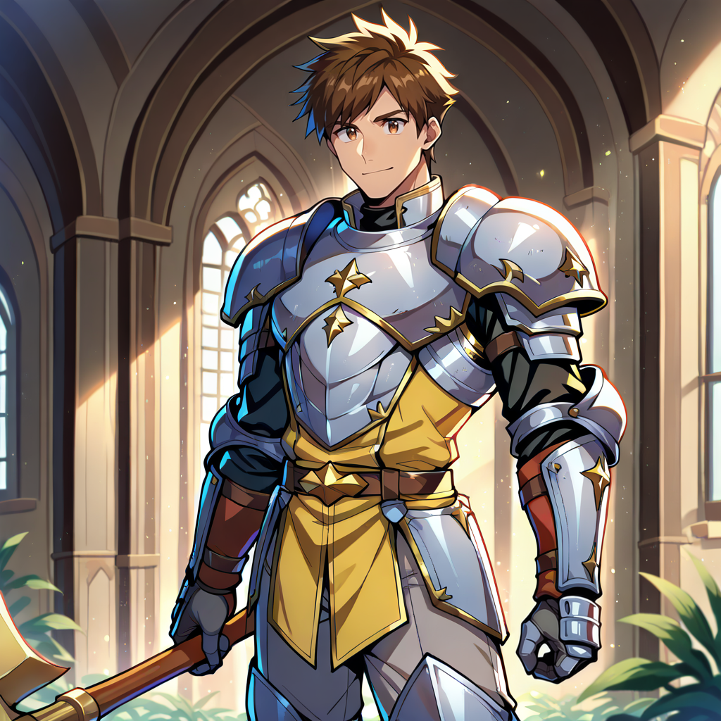 Outfit Prompts paladin, grey armor, shoulder armor, grey gloves, armored gloves, armored boots, grey boots, grey pants, gold trim, yellow shirt