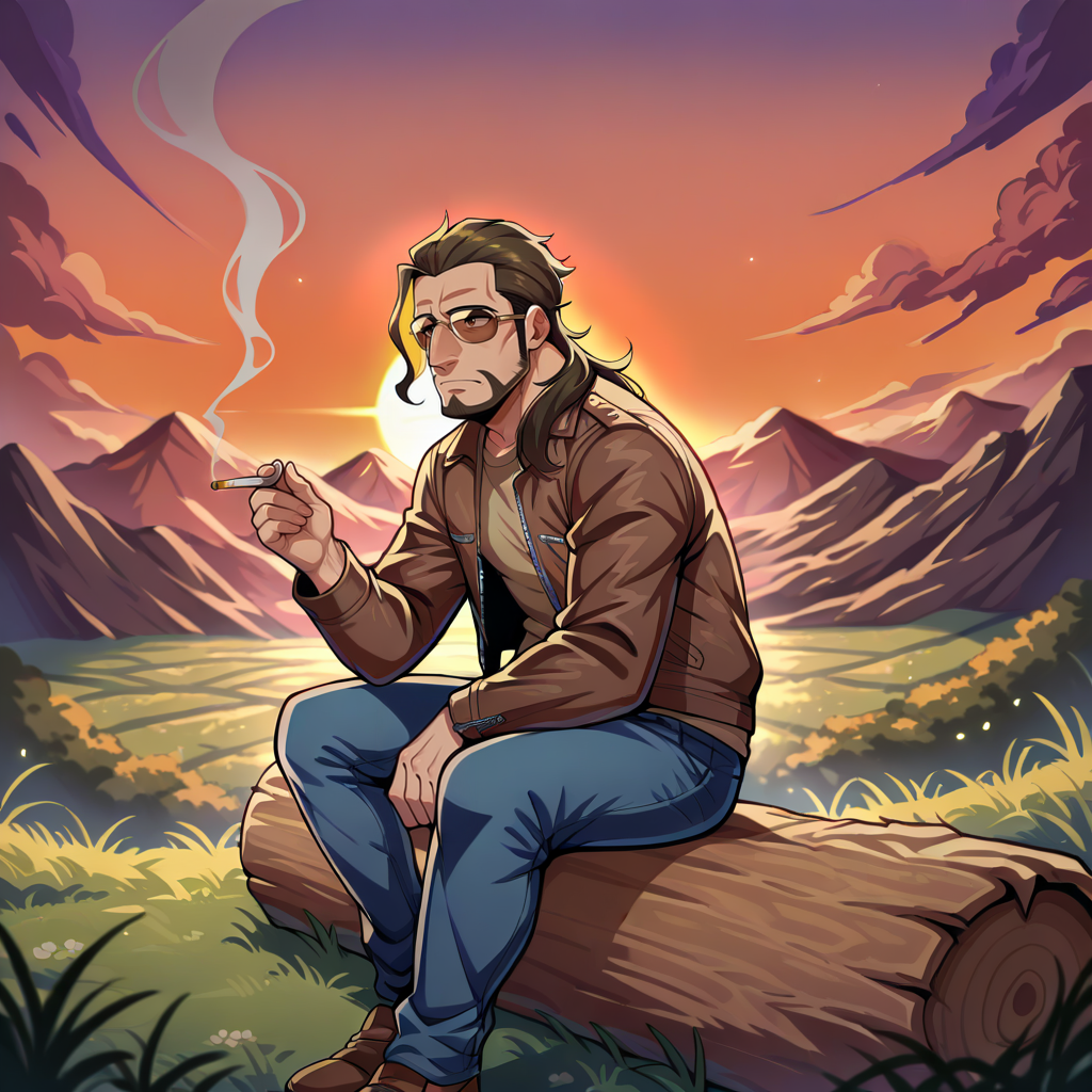 1boy, solo, <lora:male_solo_focus:1>, male focus, dark brown hair, forehead, single bang, single sidelock, hair slicked back, long hair, brown eyes, old man, mustache stubble, full beard