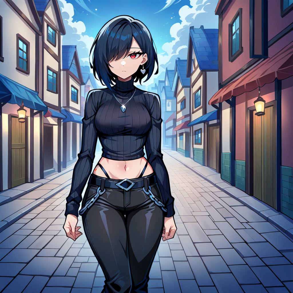 Outfit Prompts black sweater, turtleneck, silver pendant, navel, midriff, black belt, highleg panties, black pants, chain belt, black boots, single earring, broken heart earring