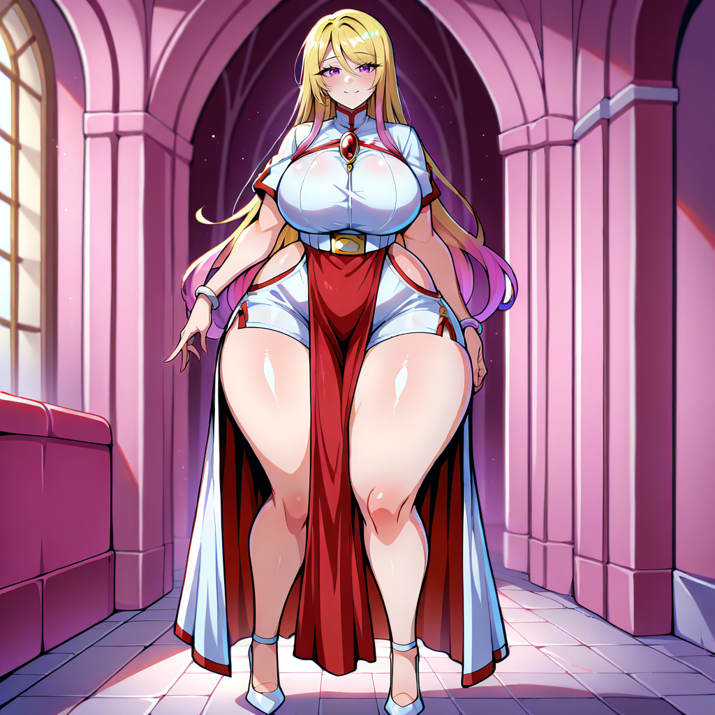 1girl, solo, blonde hair, long hair, hair between eyes, bangs, pink highlights, gradient hair, sidelocks, swept bangs, purple eyes, most beautiful woman in the world