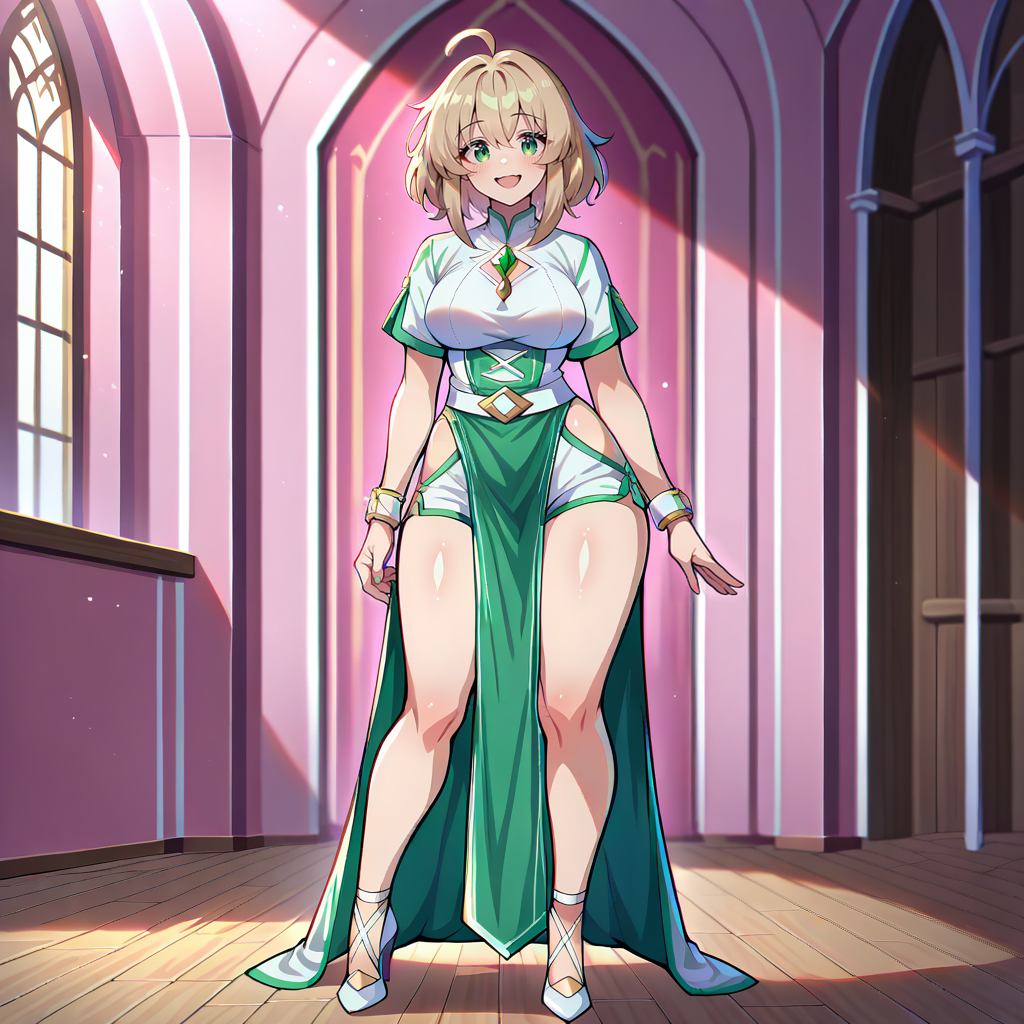 white pendant, green gemstone, white shirt, short sleeves, green trim, hip vent, white shorts, white belt, white bracelet, multiple bracelets, shorts under dress, highleg dress, green pelvic curtain, side pelvic curtain, white lace-up heels