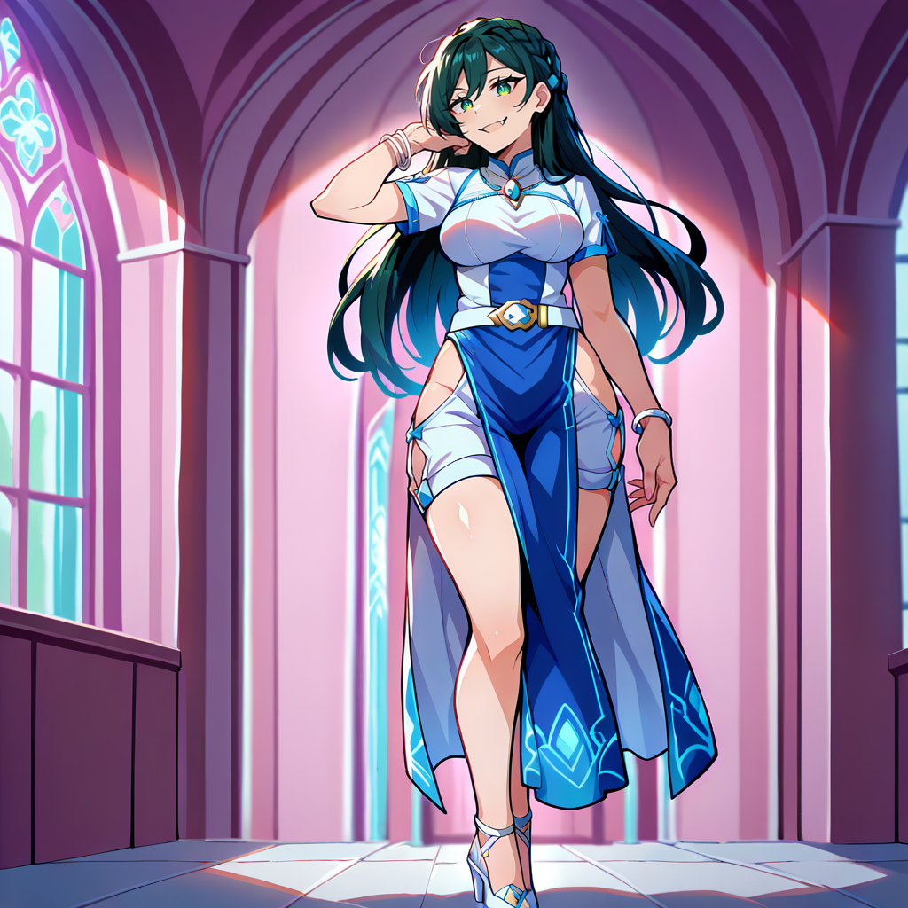 white pendant, blue gemstone, white shirt, short sleeves, blue trim, hip vent, white shorts, white belt, white bracelet, multiple bracelets, shorts under dress, highleg dress, (blue pelvic curtain:1.2), side pelvic curtain, white lace-up heels