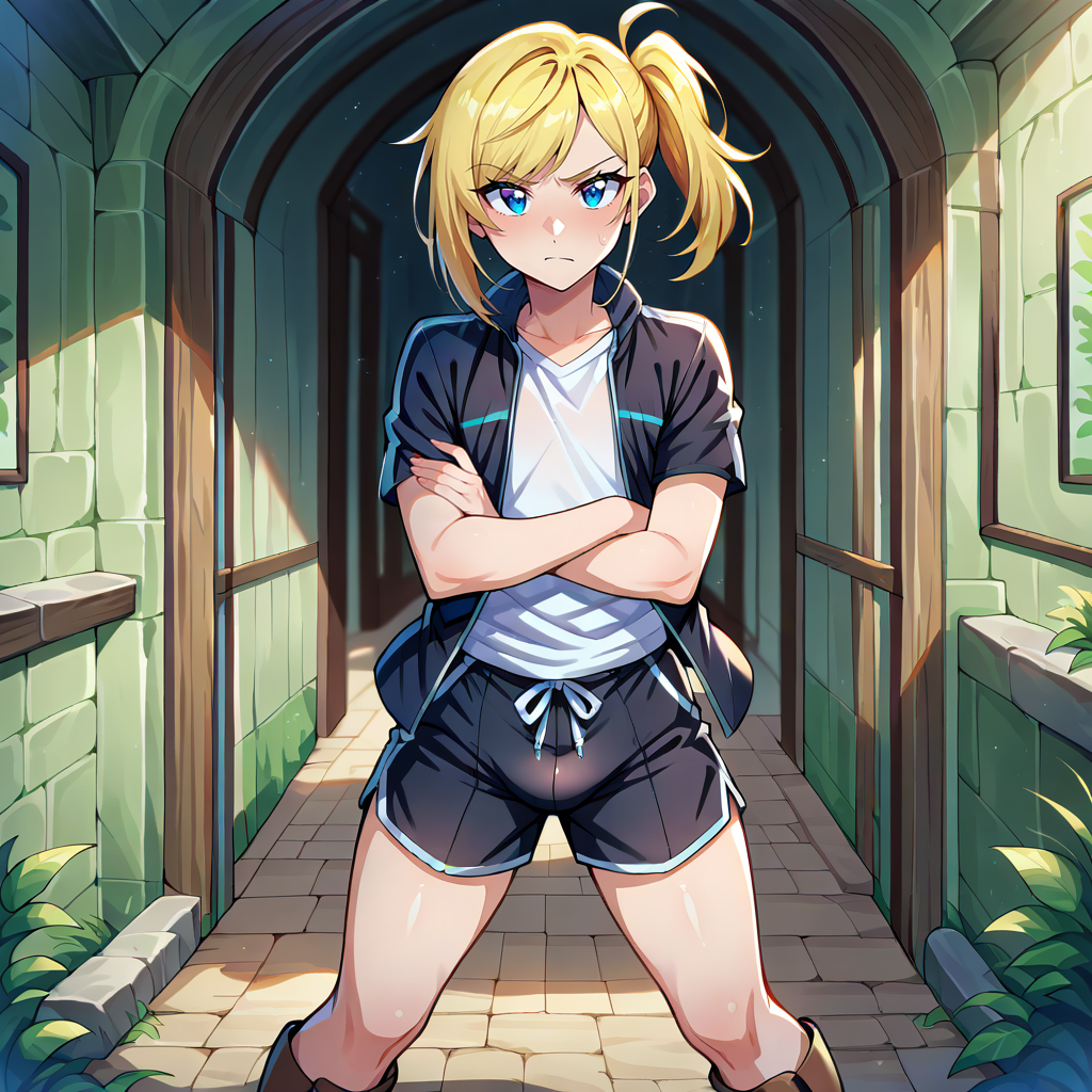 Physical Prompts 1boy, solo, otoko no ko, blonde hair, gold hair, swept bangs, side ponytail, blue eyes