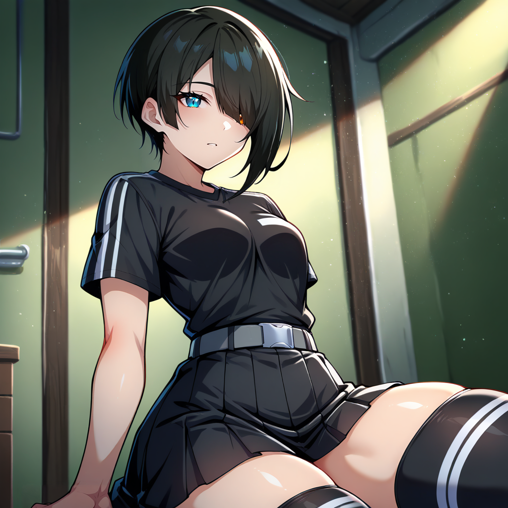 1girl, solo, black hair, single sidelock, short hair, long hair, hair over one eye, blue eyes