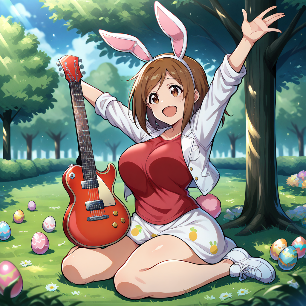 red rabbit ear, fake animal ears, easter bunny \(cosplay\), rabbit tail, red shirt, egg print, rabbit print, white jacket, white skirt, white shoes