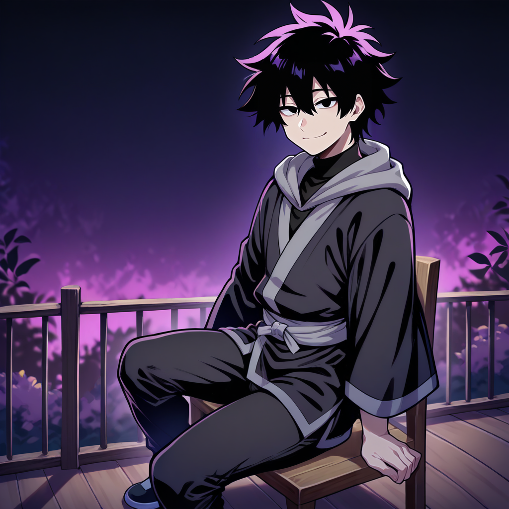 black kimono, short kimono, grey trim, black shirt, black pants, black shoes, hood down, grey belt