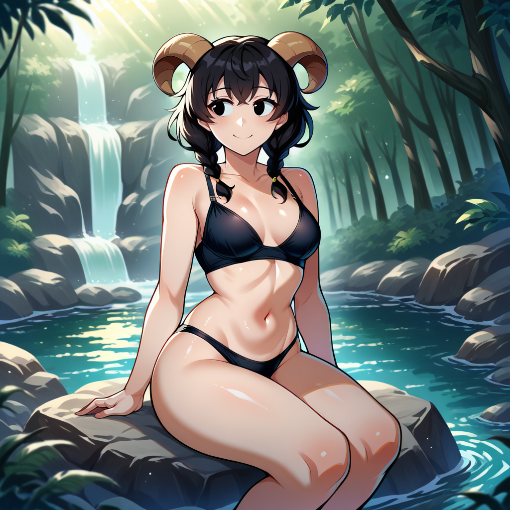 1girl, solo, black hair, medium hair, single sidelock, twin braids, brown horns, (goat horns:1.2), black eyes