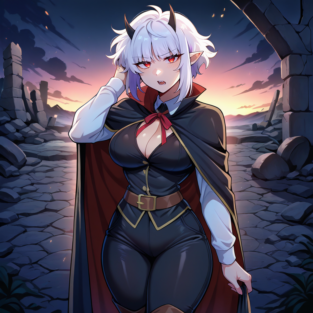 1girl, solo, white hair, blunt bangs, messy hair, short hair, sidelocks, (black horns:1.1), pointy ears