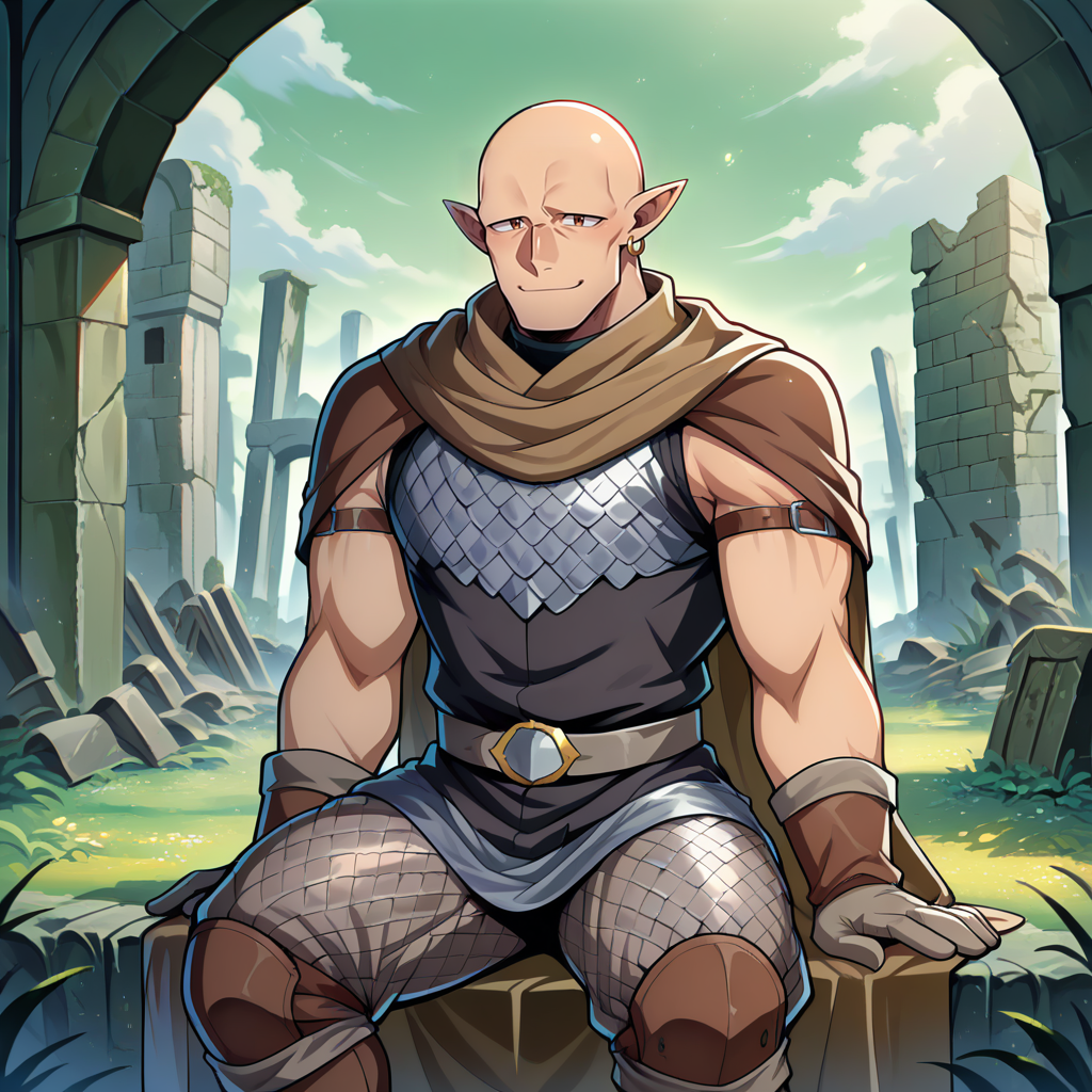 1boy, solo, <lora:male_solo_focus-000009:1>, male focus, bald, brown eyes, pointy ears, gold earrings, no eyebrows, (muscular:1.1)