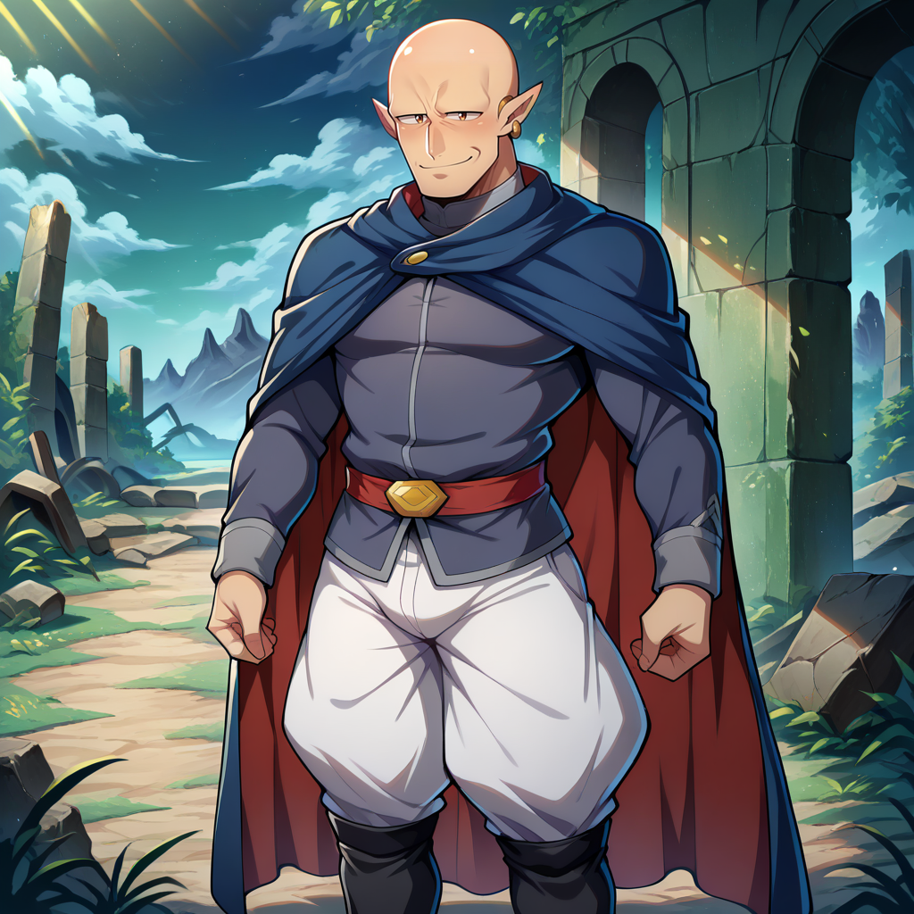 1boy, solo, <lora:male_solo_focus-000009:1>, male focus, bald, brown eyes, pointy ears, gold earrings, no eyebrows, (muscular:1.1)
