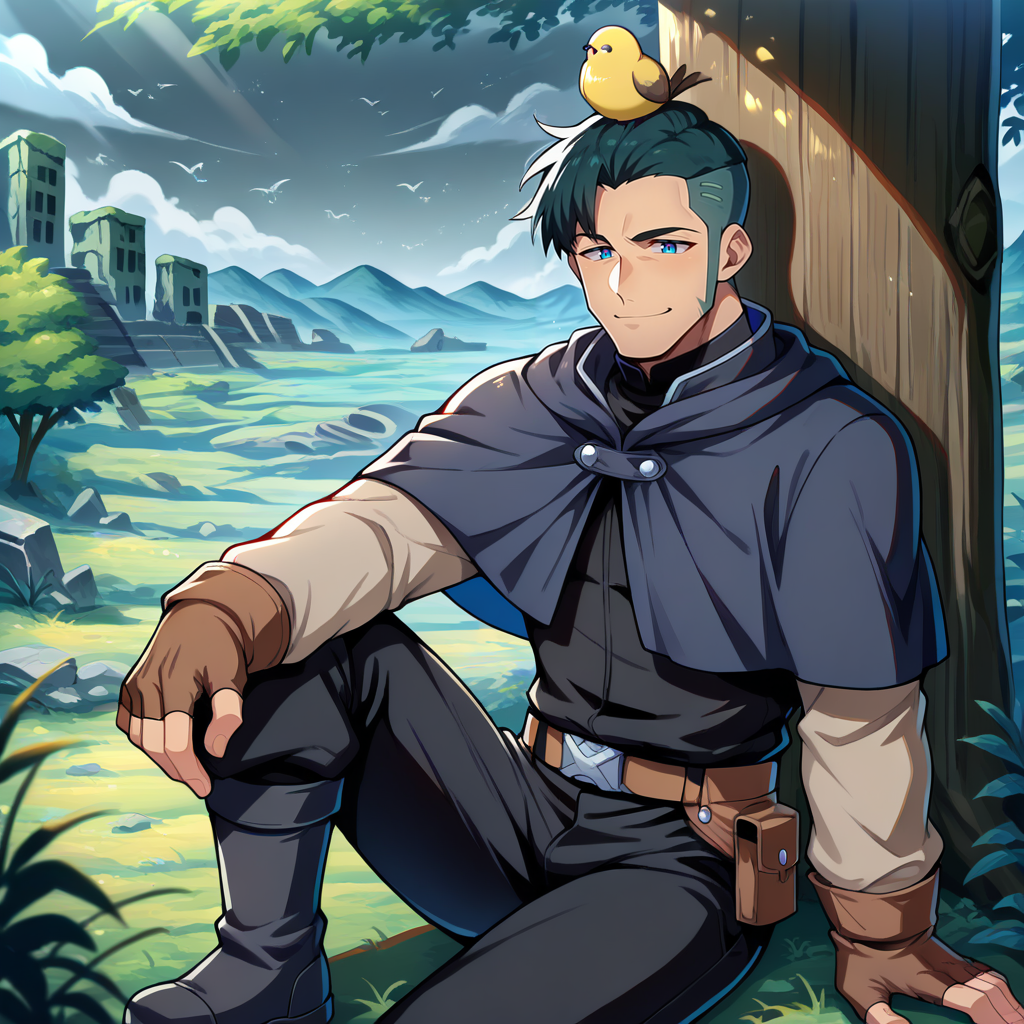 dark grey capelet, black shirt, brown belt, beige sleeves, brown gloves, fingerless gloves, black pants, dark gray boots