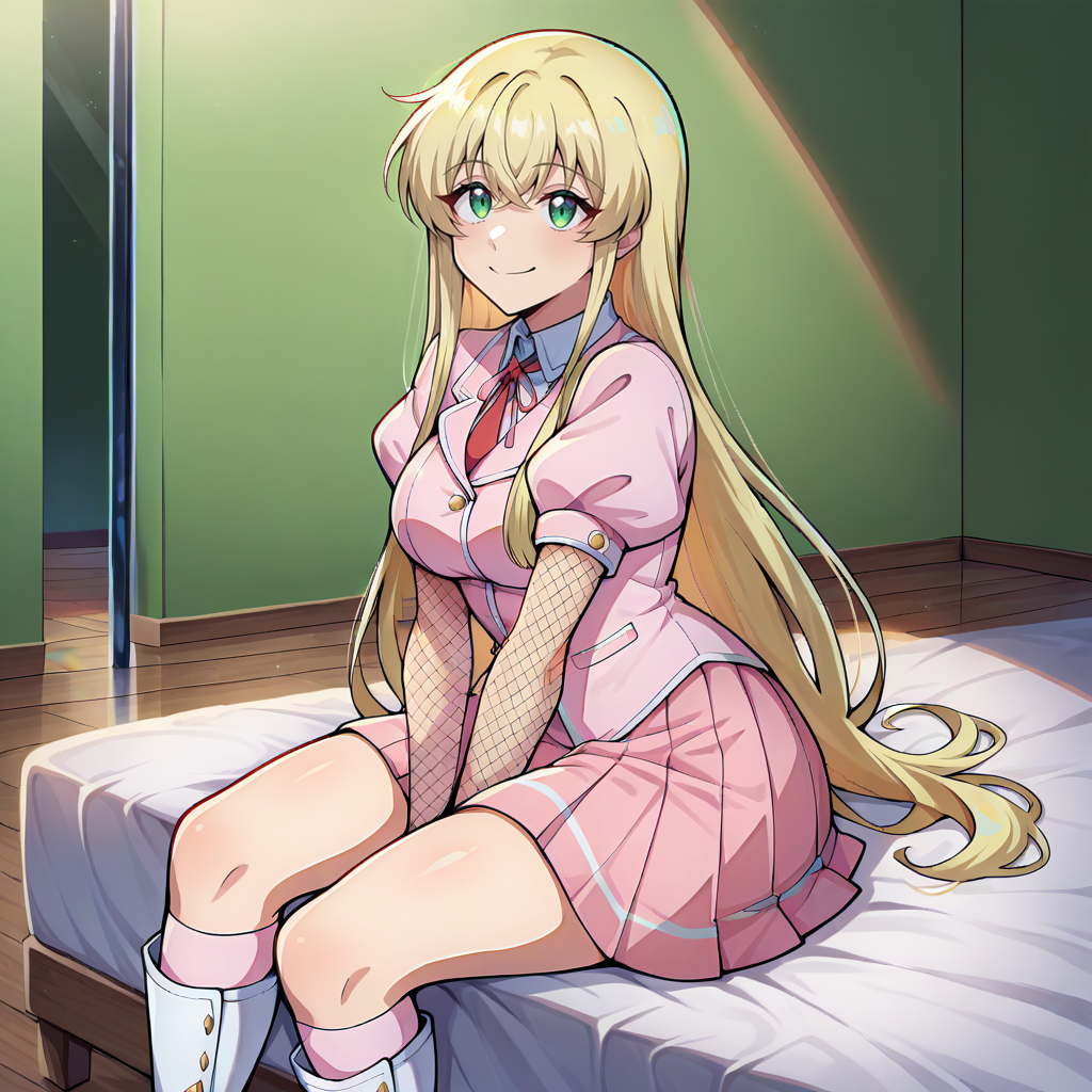 Outfit Prompts grey shirt, pink jacket, short sleeves, puffy sleeves, fishnet armwear, pink fishnets, white collar, red necktie, neck ribbon, pink skirt, pleated skirt, pink kneehighs, white boots, zettai ryouiki
