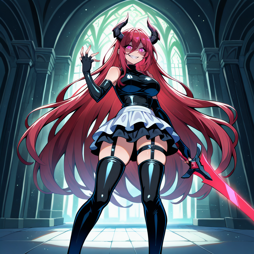 1girl, solo, red hair, hair between eyes, long sidelocks, very long hair, disheveled hair, black horns, demon horns, pink eyes, slit pupils