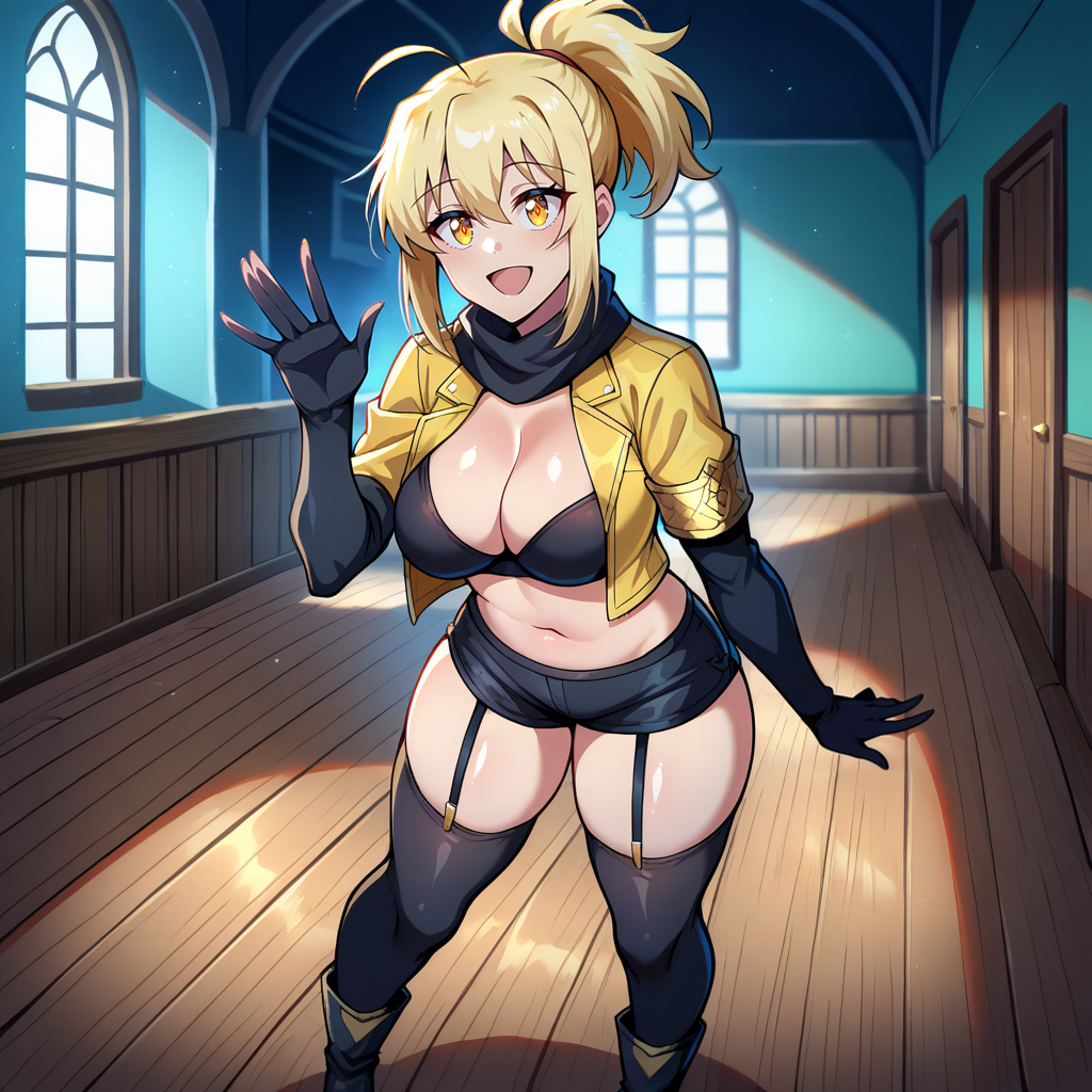 Outfit Prompts black tie, hair tie, bangs, sidelocks, black scarf, yellow jacket, open jacket, no shirt, (black bra:1.1), black shorts, black glove, single glove, elbow glove, gold armband, garter belt, black thighhighs, black boots