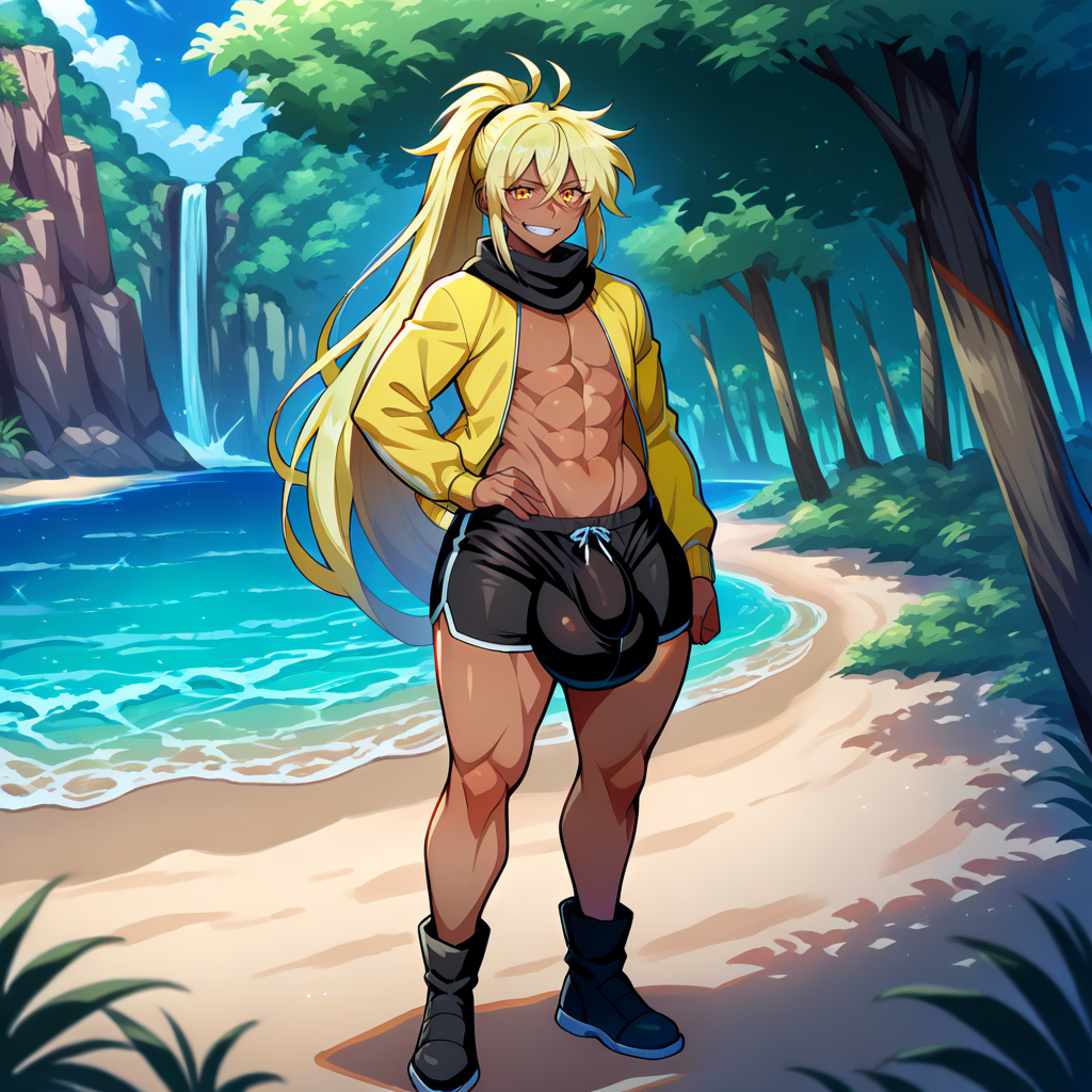 black tie, hair tie, bangs, sidelocks, black scarf, yellow jacket, open jacket, no shirt, black shorts, huge bulge, black boots