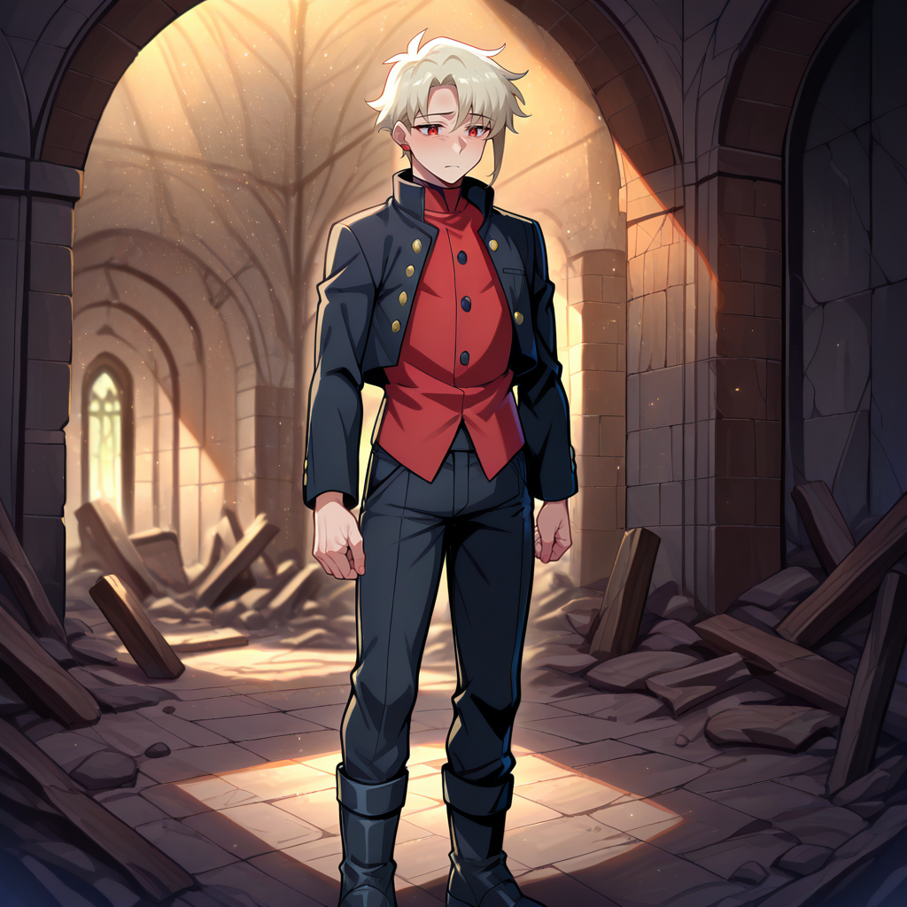 red shirt, black buttons, black jacket, uneven sleeves, black pants, black boots