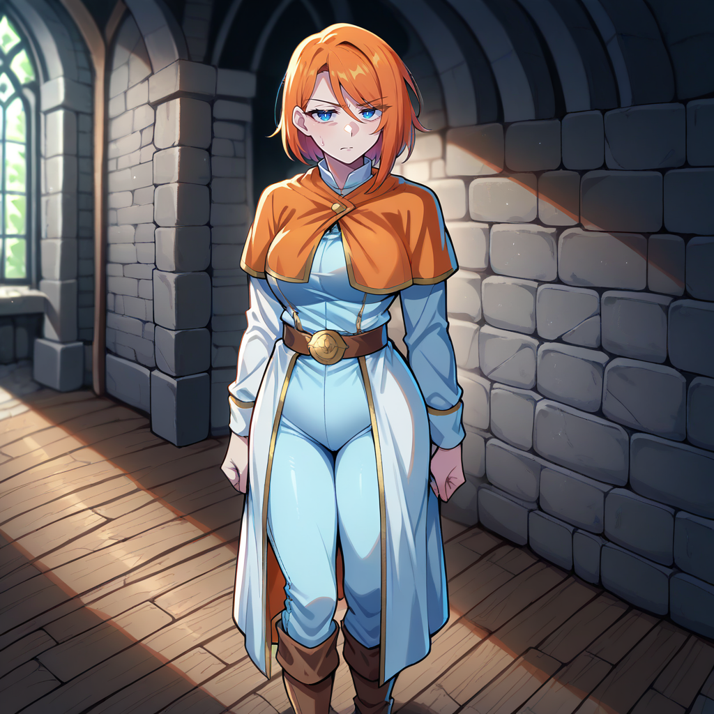 light blue shirt, white coat, long coat, gold trim, white wristband, light blue pants, brown boots, medieval, robe, orange capelet, brown belt