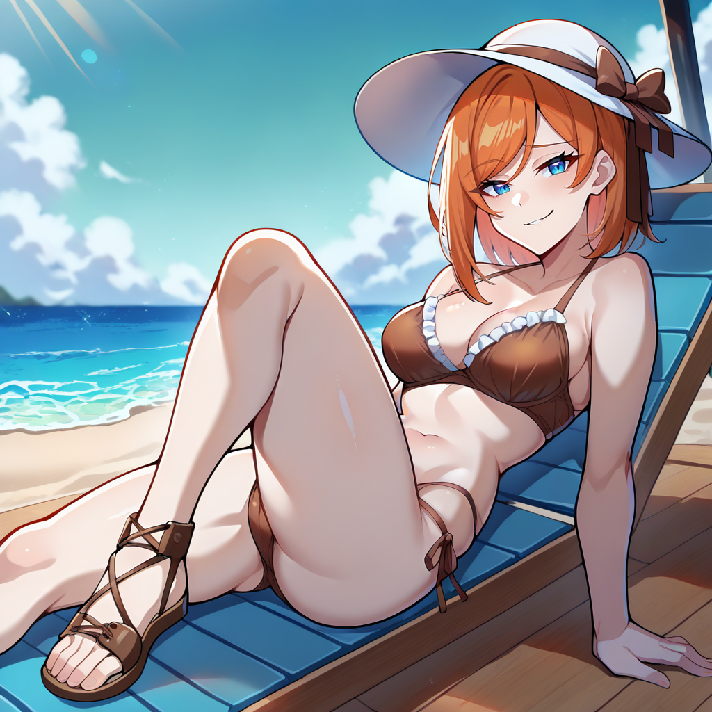 cloche hat, white hat, hat ribbon, brown ribbon, sunglasses, brown bra, brown panties, swimsuit, frilled bra, frilled panties, side-tie panties, side-tie swimsuit, brown sandals, cross-laced sandals