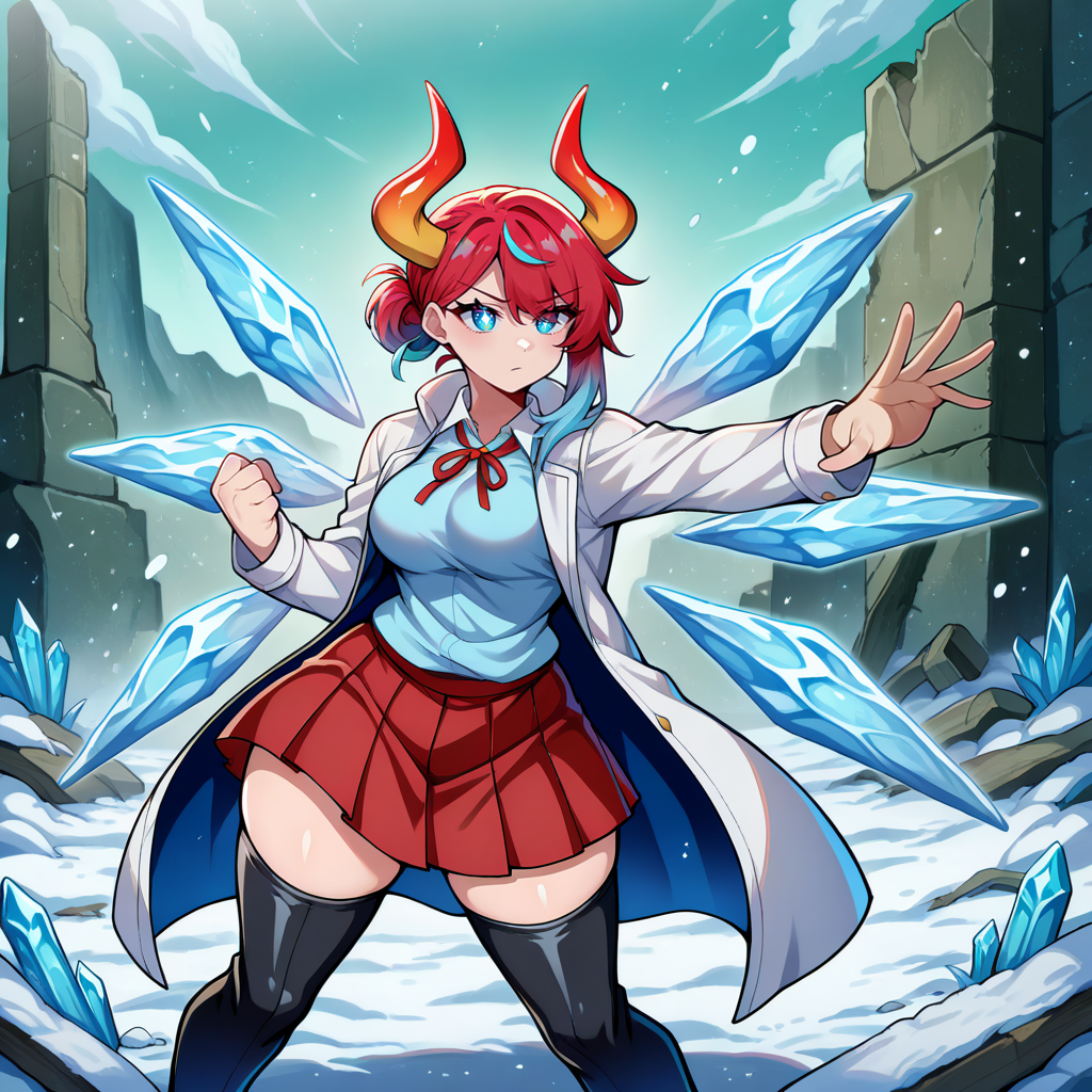 1girl, solo, red hair, from red to light blue hair, gradient hair, light blue streaks, streaked hair, very short hair, hair bun, single hair bun, single sidelock, light blue eyes, snowflake pupils, ice crystal, crystal wings, cirno \(cosplay\), horns, curled horns, dragon horns, gold and red horns stripped horns