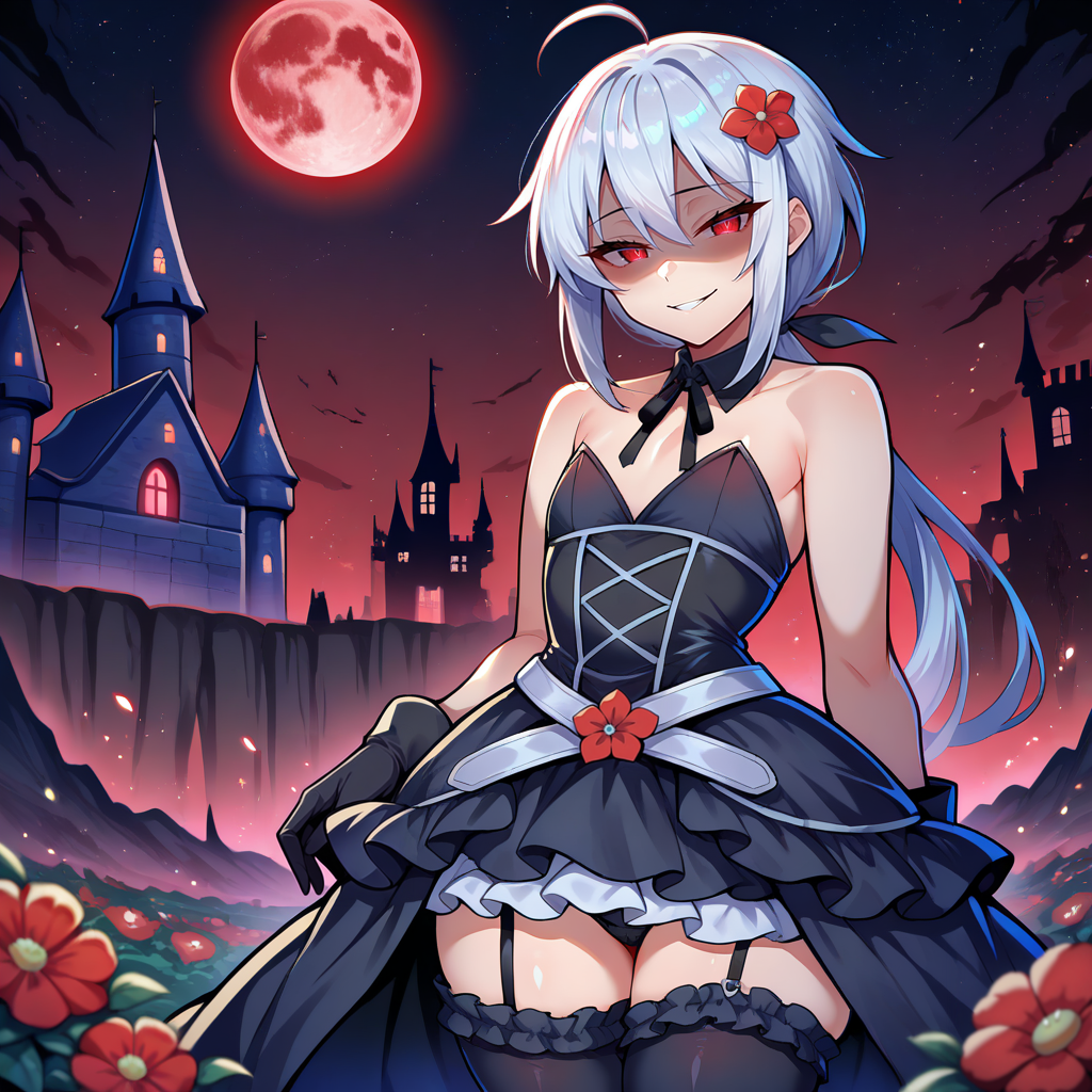 Outfit Prompts red flower ornament, hair ornament, black dress, frilled dress, black corset, black collar, detached collar, black ribbon, neck ribbon, layered dress, open dress, zettai ryouiki, black thighhighs, frilled thighhighs, garter straps, white belt, black gloves, black panties sleeveless, bare shoulders