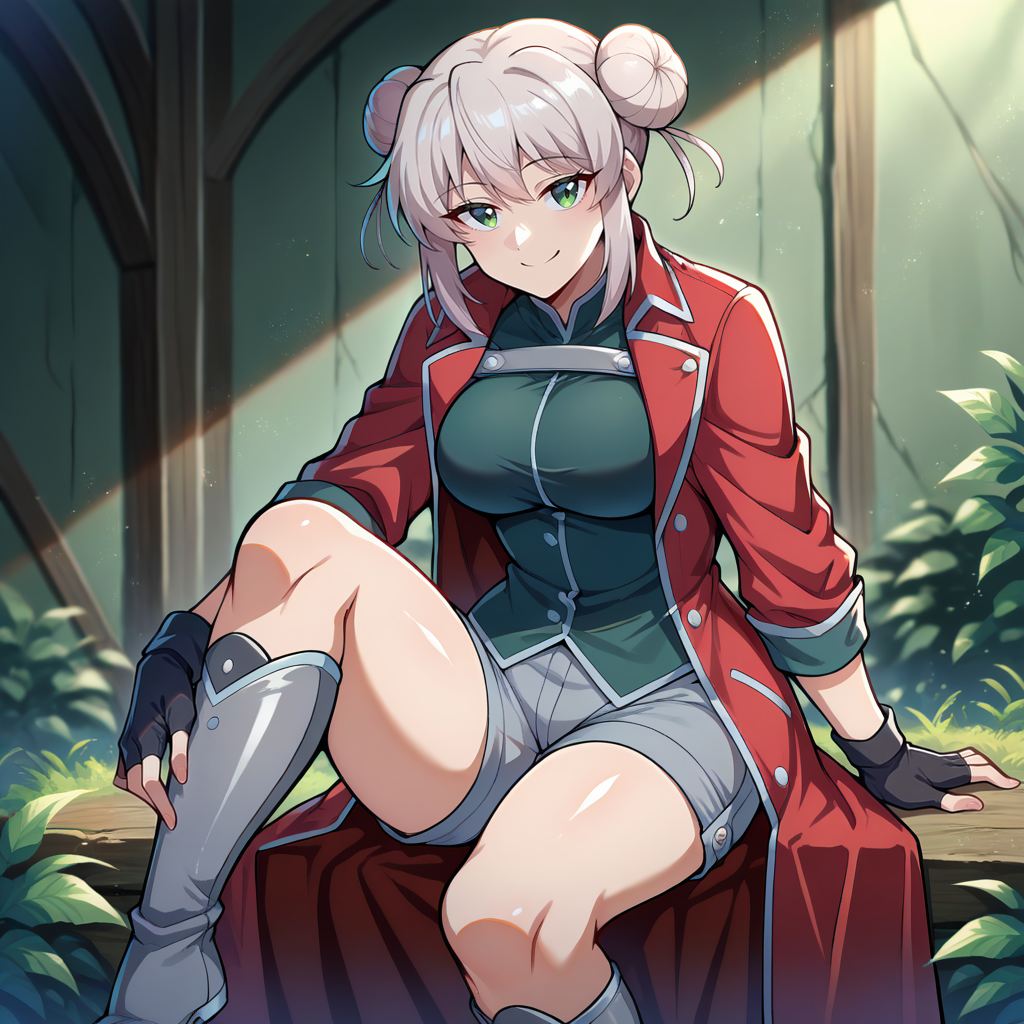 grey shirt, red coat, long coat, long sleeves, sleeves rolled up, black gloves, fingerless gloves, magical girl, grey shorts, grey boots, knee boots