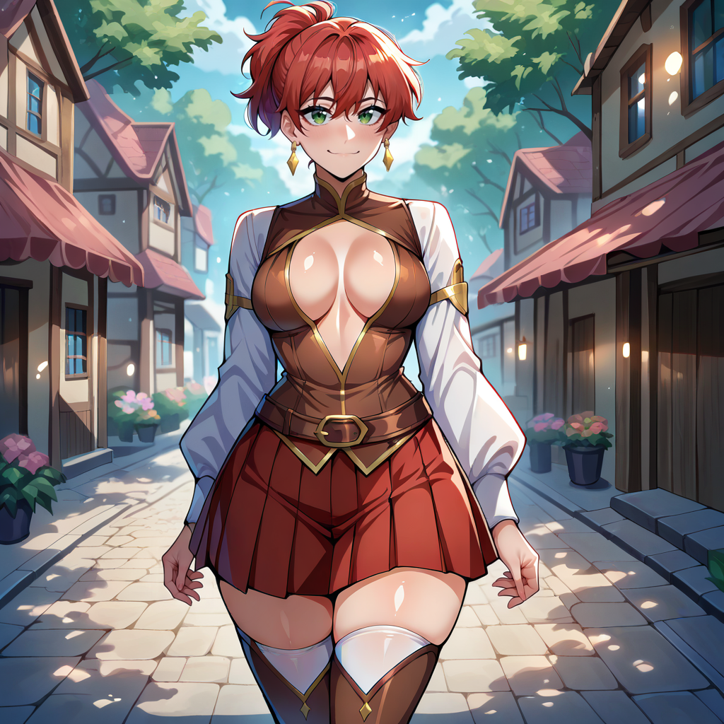 Outfit Prompts brown corset, cleavage cutout, center opening, white sleeves, gold trim, red skirt, pleated skirt, brown belt, white thighhighs, triangular thighhighs, brown thighlet, brown boots, thigh boots, earrings, gold earrings