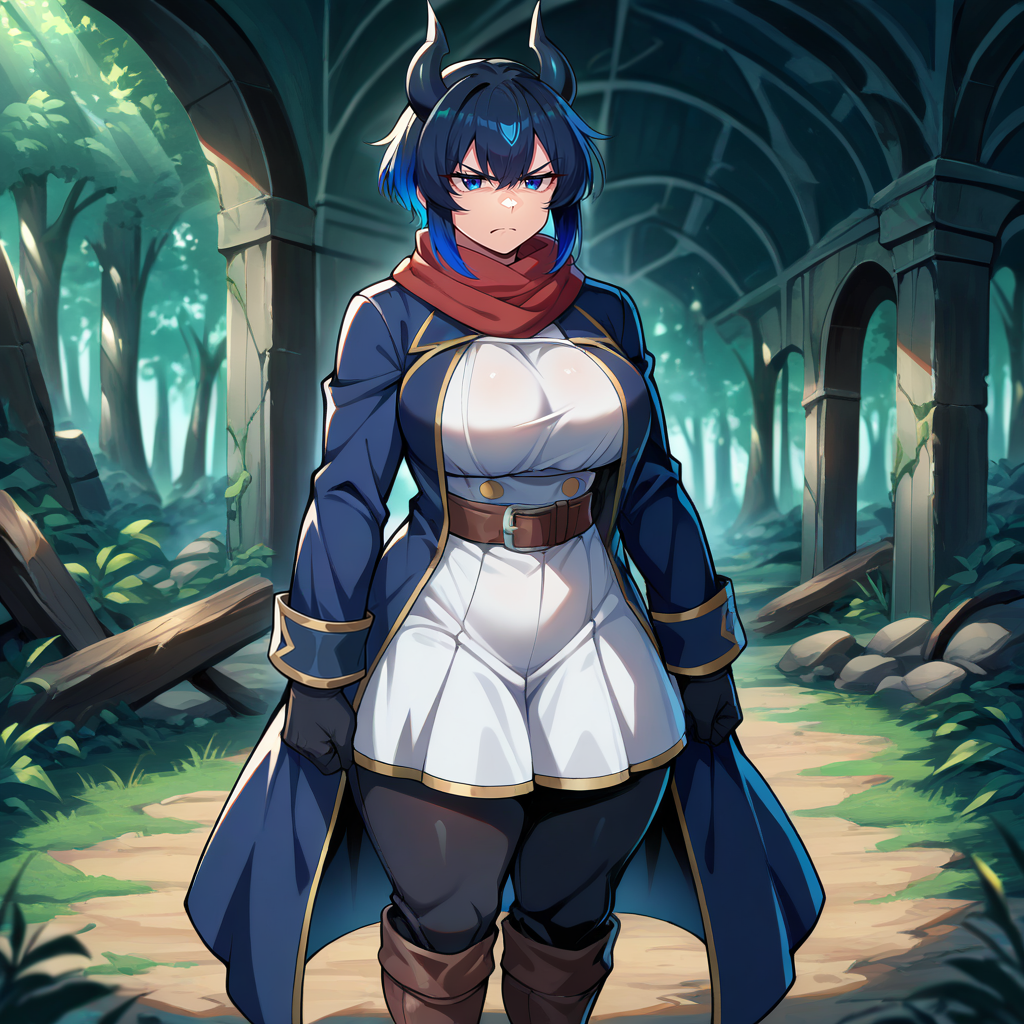 1girl, solo, black hair, dark blue hair, two-tone hair, blunt bangs, hair between eyes, short hair, sidelocks, horns, dragon horns, black horns, muscular female, dark blue eyes
