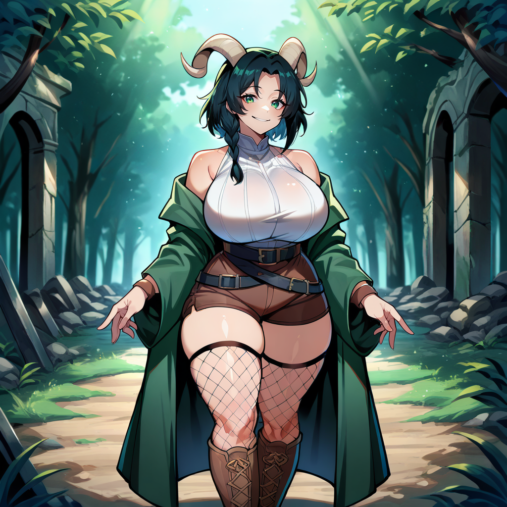1girl, solo, black hair, medium hair, single sidelock, twin braids, parted bangs, straight hair, front braid, horns, (goat horns:1.2), light green eyes