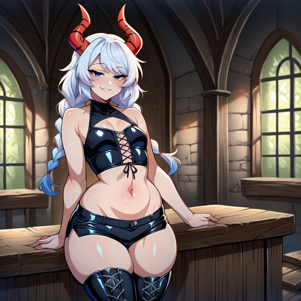 1girl, solo, white hair, square cut, twin braids, left bangs, horns, dragon horns, striped horns, red horns, dark blue eyes