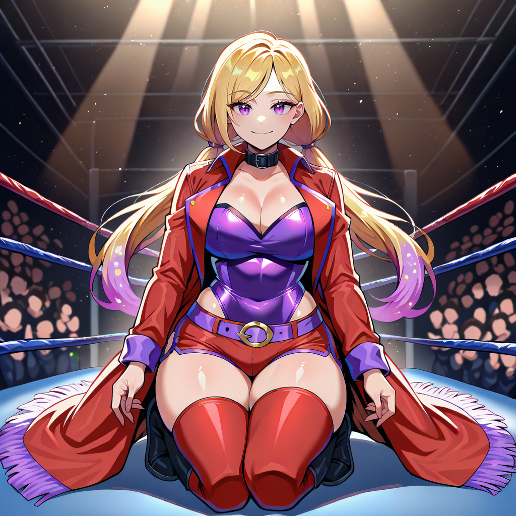 tight, red sleeves, cleavage, hip vent, purple bodysuit, purple leotard, highleg leotard, leotard over shorts, wrestling outfit, purple glitter, red shorts, short shorts, black boots, knee boots, red coat, long coat, purple belt, black knee pads, zettai ryouiki
