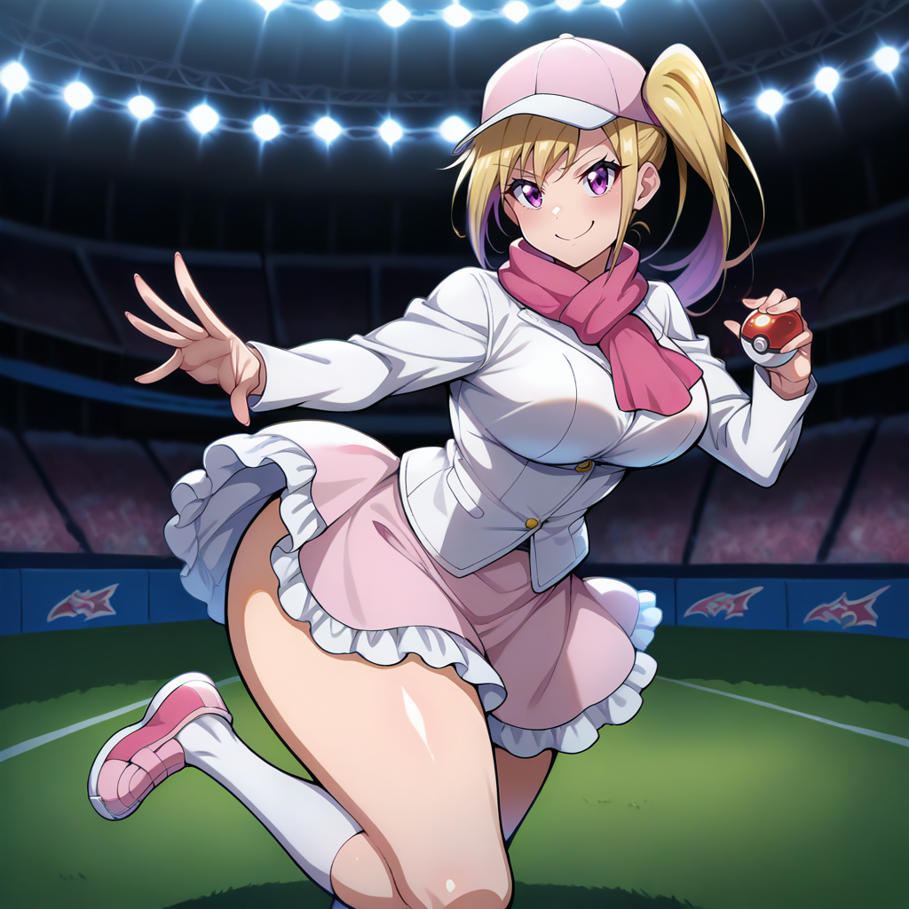 hair tie, pink scarf, white jacket, long sleeves, white shirt, light pink skirt, frilled skirt, medium skirt, white kneehighs, pink shoes, pokemon, baseball cap, pink cap