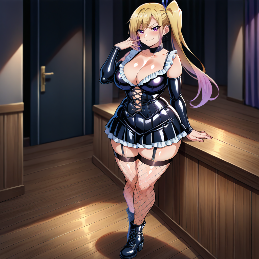 Outfit Prompts hair tie, detached collar, latex corset, black corset, lace-up corset, black dress, latex dress, short dress, center opening, black sleeves, latex sleeves, white frills, shoulder frills, black choker, latex choker, black skirt, latex skirt, pleated skirt, frilled skirt, garter belt, latex belt, fishnet thighhighs, black boots, latex boots, ankle boots