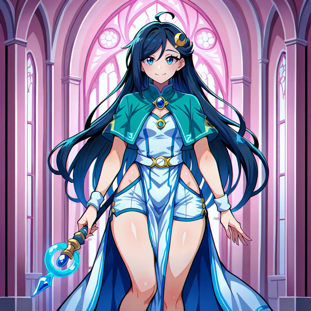 1girl, solo, black hair, long hair, swept bangs, hair between eyes, ahoge, blue eyes