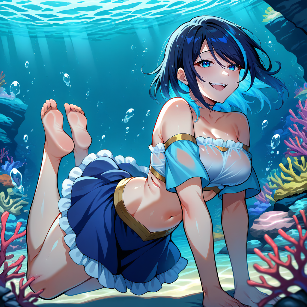 light blue tank top, gold trim, light blue sleeves, short sleeves, bare shoulders, detached sleeves, strapless crop top, midriff, navel, dark blue skirt, white frilled skirt, gradient tight, pink to light blue tight, barefoot