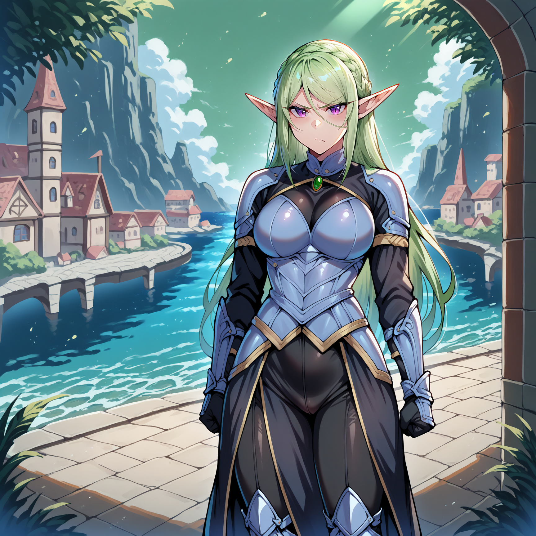 1girl, solo, green hair, long hair, sidelocks, hair between eyes, swept bangs, crown braid, elf ears, elf, elf female, purple eyes