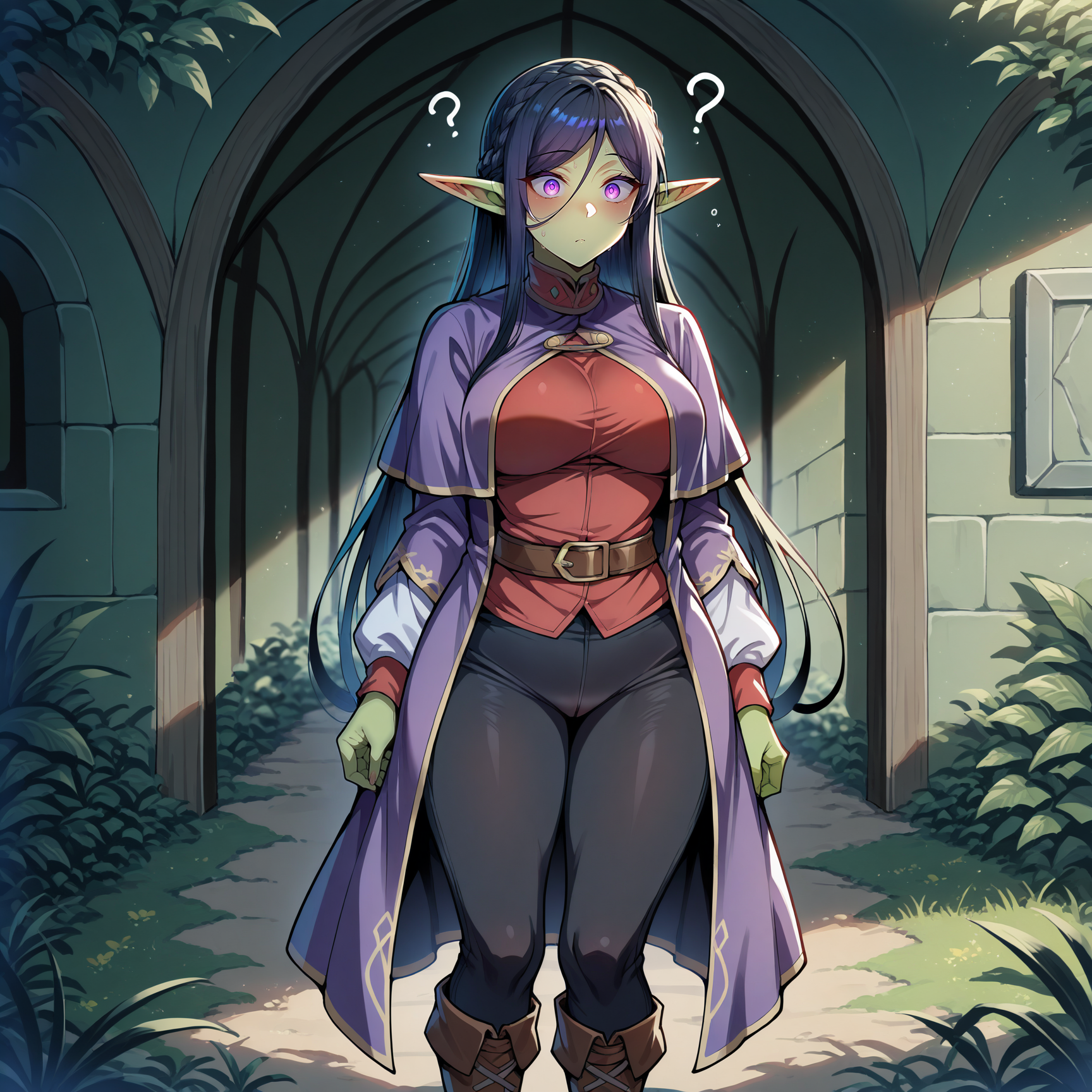 1girl, solo, black hair, long hair, sidelocks, hair between eyes, straight hair, swept bangs, crown braid, elf ears, elf, elf female, plant girl, (colored skin, green skin:1.5), purple eyes
